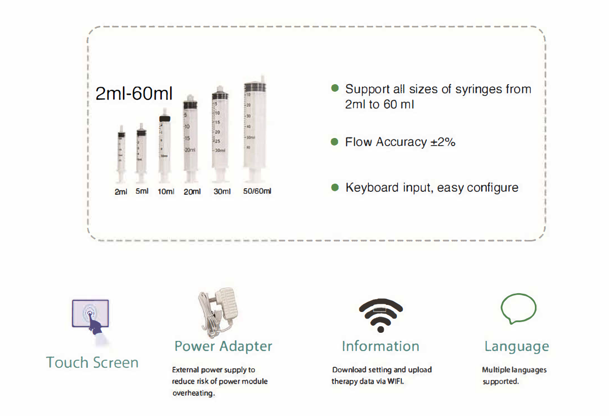 2ml Syringe: 100ml/h; 5ml Syringe:150ml/h; 10ml Syringe:400ml/h; 20ml Syringe:600ml/h; 30ml Syringe:1000 ml/h; 50/60ml Syringe:2100ml/h. |